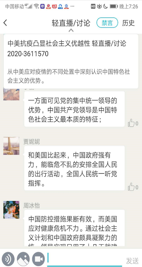 挖掘课程思政元素,充分发挥第一课堂“主渠道”作用。我院教师在备课过程中深入挖掘课程中蕴含的思政元素,同时高度关注当前疫情形势的发展及抗击疫情中体现出的制度优势、涌现出的先进事迹,巧妙融入专业课教学,组织学生进行研讨。我院唐萍教授在《毛泽东思想和中国特色社会主义概论体系》教学中和同学们探讨“中美两国的疫情形势”并积极组织云班课讨论,同学们从中美两国应对疫情的不同处置中,深刻体会到中国特色社会主义制度的优越性。