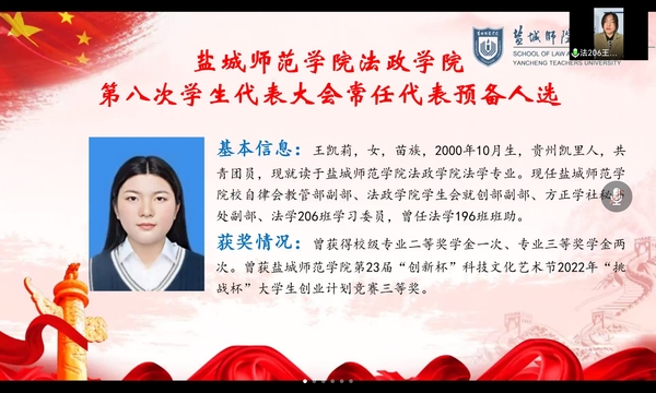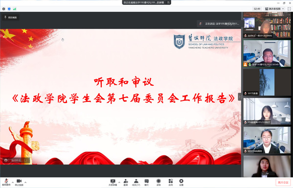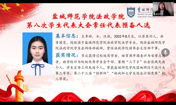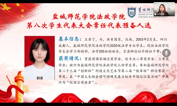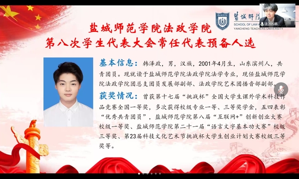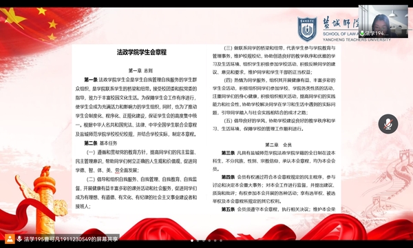 为深入落实习近平总书记有关青年工作的重要讲话精神,总结经验、展望未来,不断把握机遇、锐意进取,团结带领全院青年大学生以崭新的姿态迎接新的任务和挑战。2022年4月30日晚,法政学院于线上开展了第八次学生代表大会。出席本次会议的有学工办主任王川、辅导员郭佳慧以及学生代表。