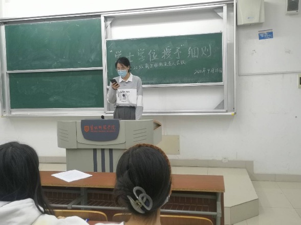 我院学习部成员将22级新生代表以及转专业同学集合到活动地点,面向刚到法政学院的新同学们进行学士学位授予实施细则以及补充规定的重点讲解,强调了法政学院的平均学分绩点要求,并将相关文件发放至同学,请新同学会议后再次学习。