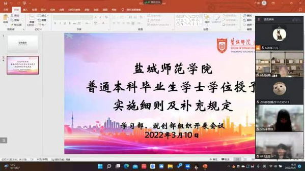 2022年3月10日下午5点,我院学习部在线上与就创部对学士学位授予细则,绩点相关要求以及学业预警等方面内容进行对接。