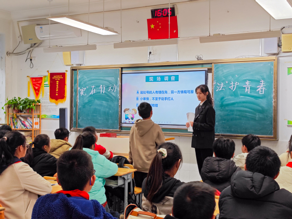 12月2日上午,167.nt必赢官网师生来到盐城市初级中学开展亭湖区司法局主办的“宪”在行动,“法”护青春——未成年人守护计划主题活动。在国旗下,大学生法治宣讲团通过朗诵将宪法知识宣讲给青少年学生。宣讲团成员还走进课堂,通过以案说法、互动提问和互动小游戏沉浸式普法,重点对如何杜绝不良行为、如何预防校园欺凌等问题,解读法律法规,在未成年人的心中播下法治种子,引导未成年人,增强法治意识,学会用法律武器来保护自己。