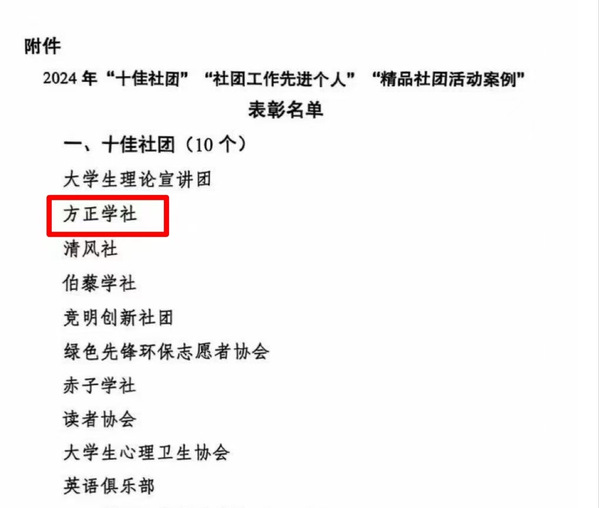 近日,在167net必赢入口2024年“十佳社团”评选工作中,经自主申报、校初审、现场评审等环节,方正学社获校“十佳社团”荣誉!